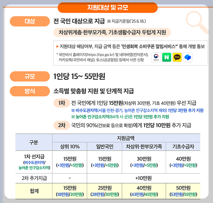 | 일반 국민 (하위 90%) | 15만 원 | +10만 원 | +5만 원 | 30만 원 |