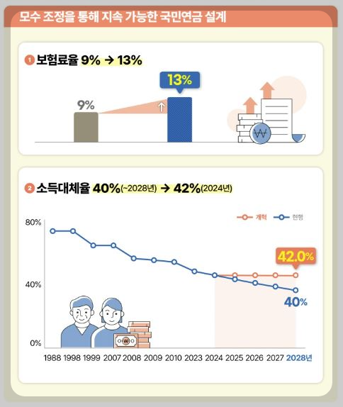 정부는 국민연금을 장기적으로 지속 가능한 제도로 개편하기 위해 보험료율을 현행 9%에서 13%로 4% p 인상한다고 발표했습니다. 이번 결정은 국민연금의 재정 안정성과 소득 보장 수준을 동시에 강화하기 위한 조치로, 단계적 인상을 통해 국민 부담을 최소화할 예정입니다.