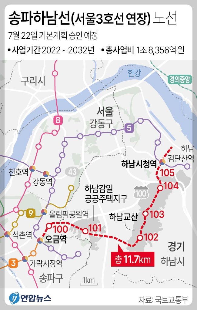 국토교통부 대도시권광역교통위원회는 서울지하철 3호선 연장사업인 송파하남선 광역철도의 기본계획을 22일 승인한다고 밝혔다. 송파하남선은 3기 신도시 하남 교산지구 광역교통개선대책의