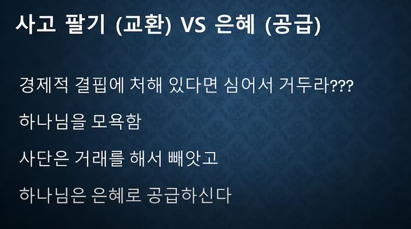 이정훈 목사님께서 1번 씨뿌리기 (십일조)에 대해서 매우 조심스럽게 받아들이라고 강조하신다. 공중 권세 잡은 사탄의 조건부 거래를 인용하면서 하나님은 은혜로 값없이 주시는 분이기에 십일조를 하면, 더 바치면, 영어시간에 배운 If~ 조건문 만약 ~을 하면, 이렇게 강조하고 전지전능하신 하나님을 근본이 없는 세력과 비교한다면 하나님을 농락하는 것이다. '풍요하길 원하는가? 그러면 지금 바치라' 이는 거래인 것이다. 사탄은 이것을 이용하고 최후에는 생명이 아닌 죽음으로 부르게 된다.
