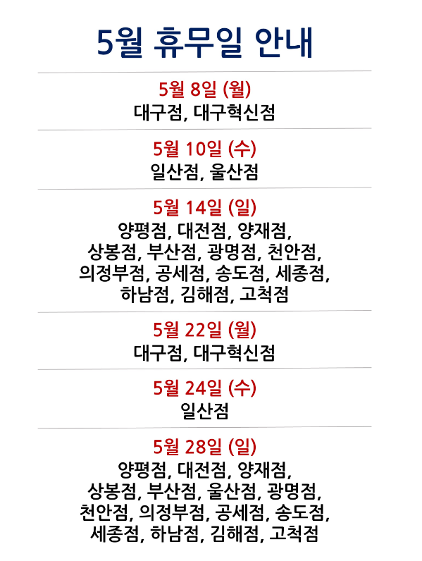 5월 28일 일요일 : 양평점, 대전점, 양재점, 상봉점, 부산점, 울산점, 광명점, 천안점, 의정부점, 공세점, 송도점, 세종점, 하남점, 김해점, 고척점