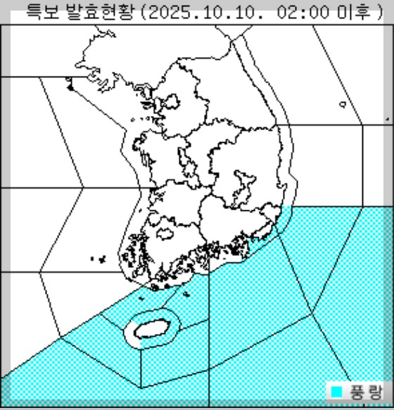 특보 발효현황 발표시각 : 2025년 10월 10일(금) 00:00 발효시각: 2025년 10월 10일(금) 02:00 이후 풍랑주의보 발효 및 해제를 반복하고 있습니다. 어업 종사자, 낚시 어선, 연안 조업 어민분들은 안전에 각별히 유의해 주시기 바라며, 오늘 하루도 무사히 일하시고 감기도 조심하세요.