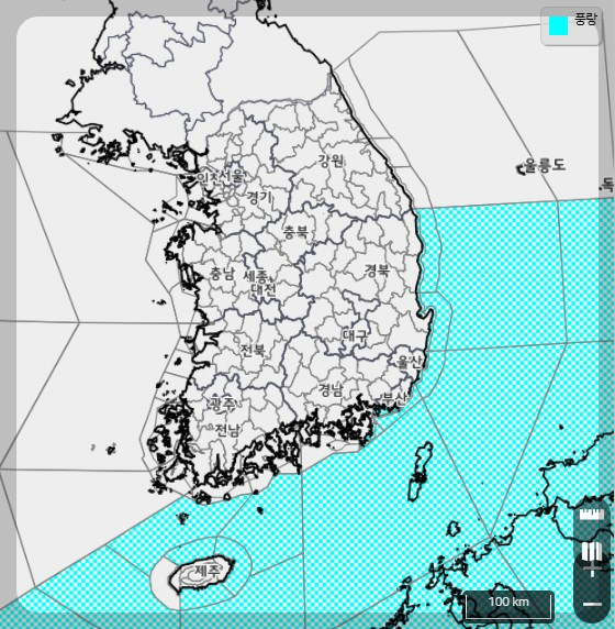 | 제주도동부앞바다중 남동연안바다 | 풍랑주의보 발표 |