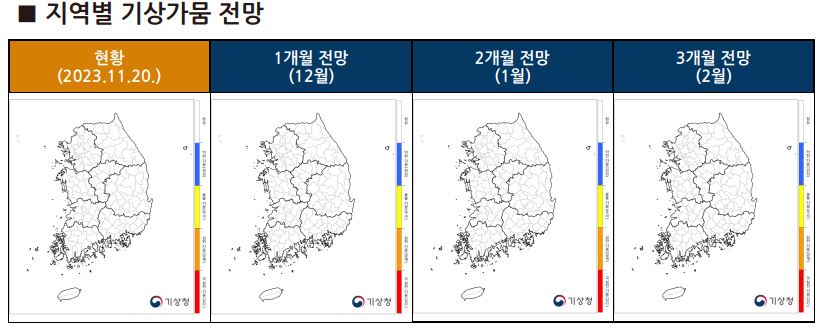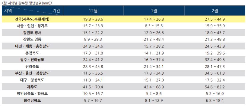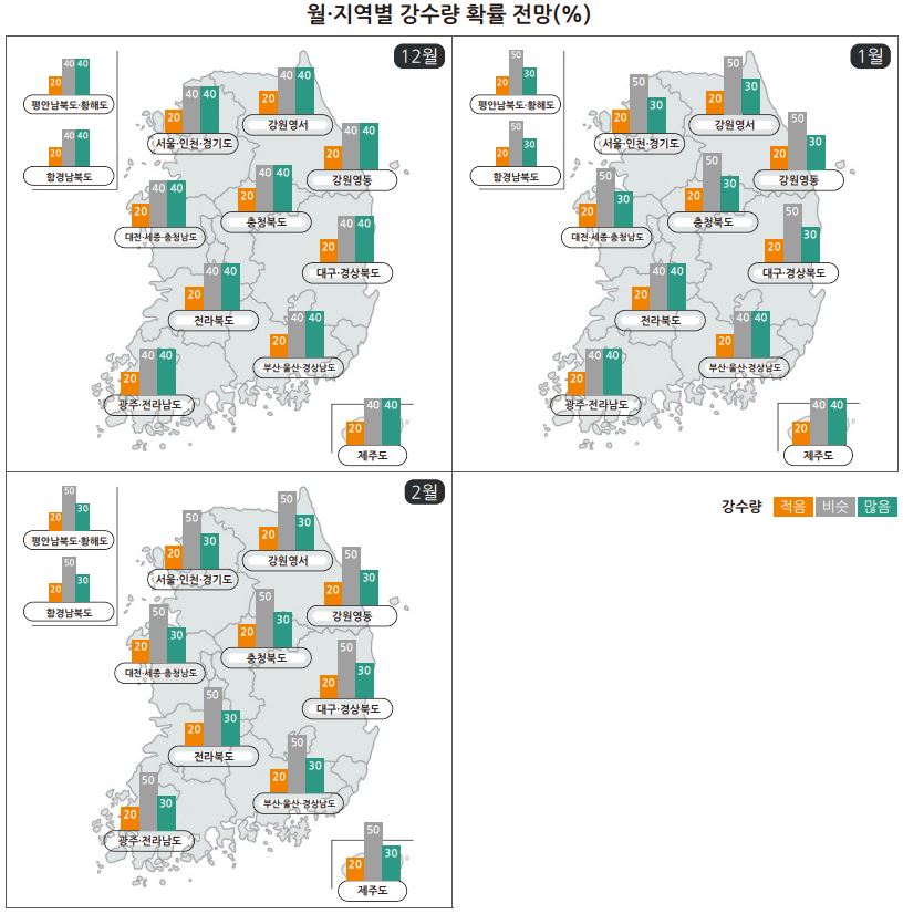 강수량 전망 : 2023년 12월 ~ 2024년 1월 2월 기간 중 12월은 평년과 비슷하거나 많을 확률이 각각 40%, 1월과 2월은 평년과 비슷할 확률이 50%