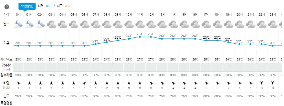 6월 11일 : 전국 구름 많음, 아침 06~09시까지 중부지방 곳에 따라 비, 오후 12~18시부터 밤 18~24시 사이 전국 내륙 소나기. 강수량 전국 내륙 5~40mm