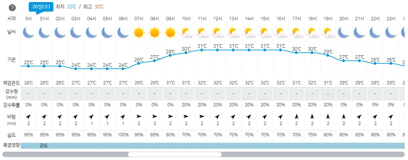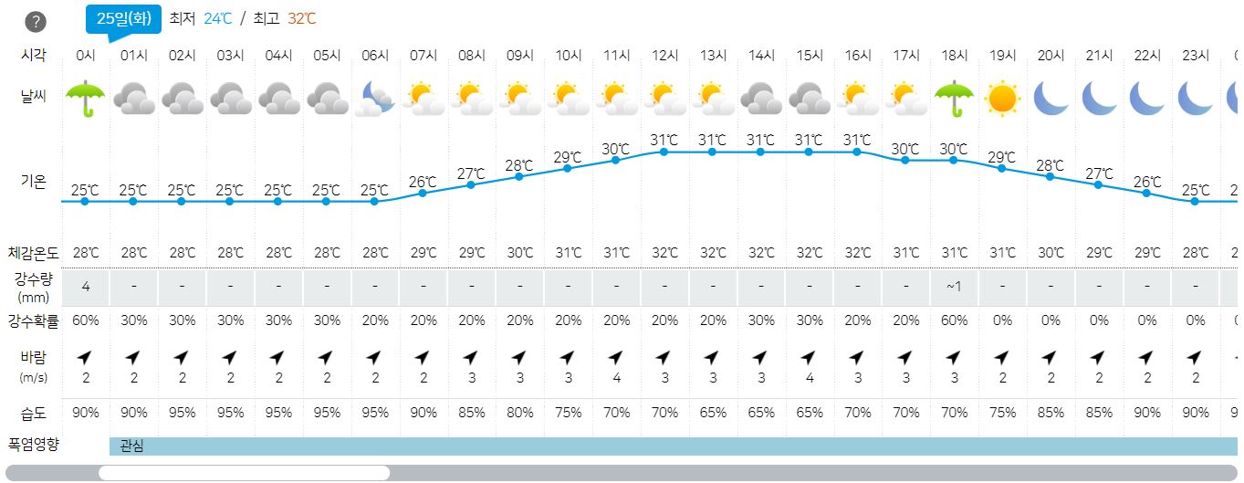 - 내일 7/25 흐림. 대구, 경북 오후 15~18시까지 가끔 비