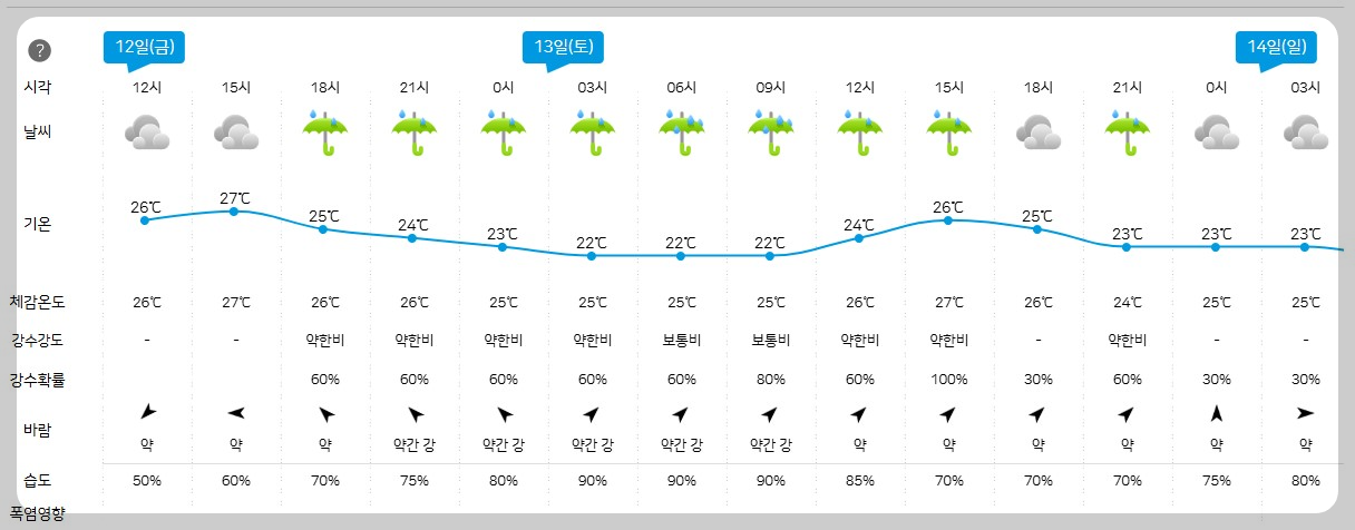 | 서울/경기 | 흐림, 비 | 흐림, 비 | 비 시작 가능 | 30~80mm |