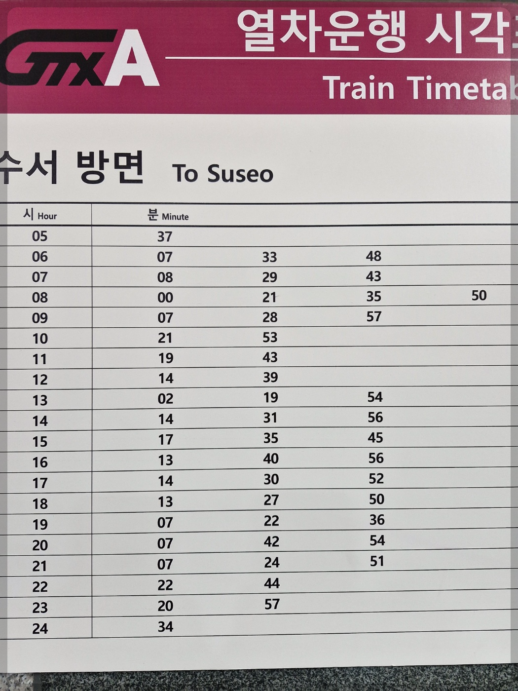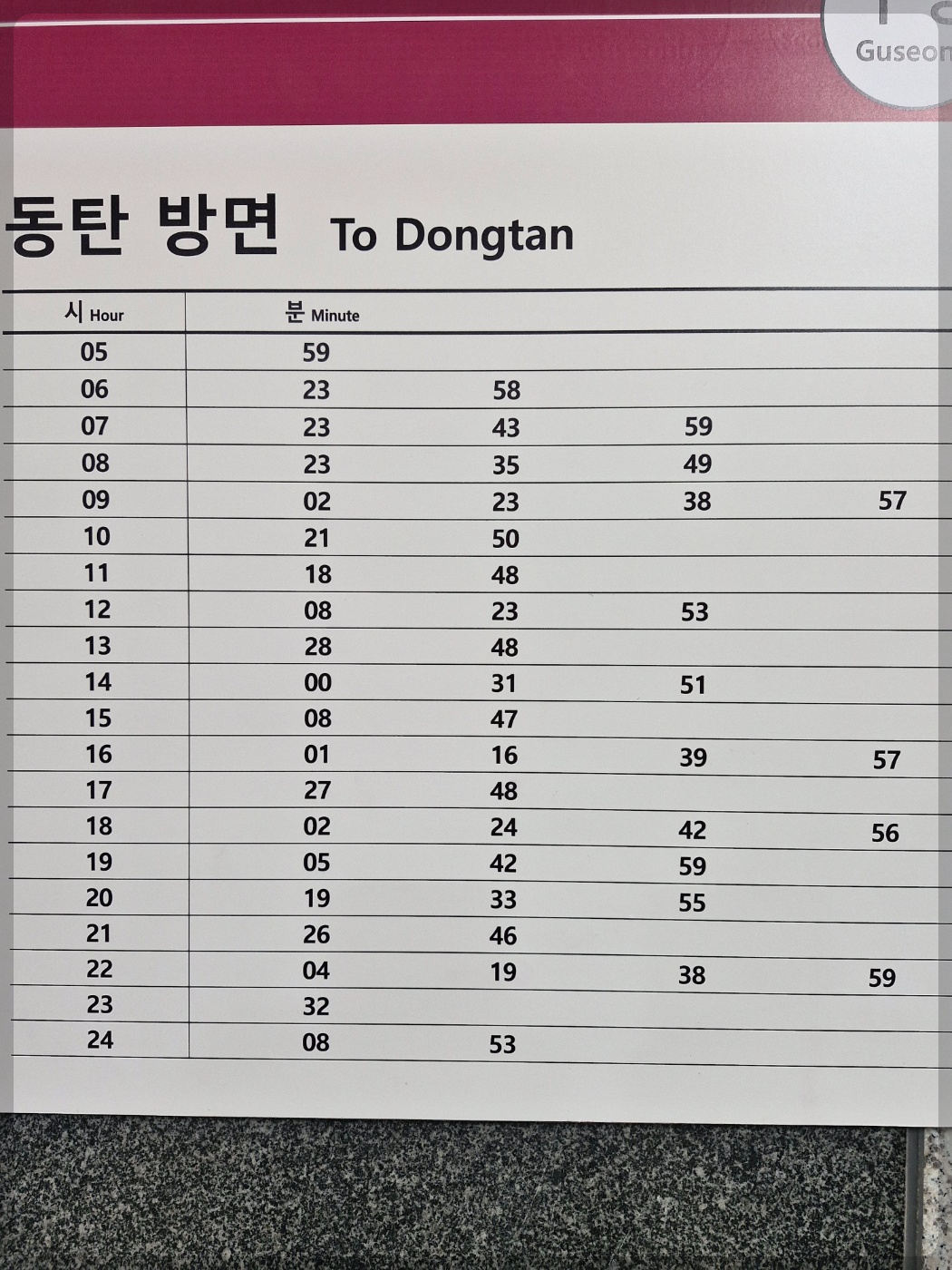 넉넉한 열차 시간 보이시죠? 이번엔 하행선 SRT 이용에 매우 편리한 GTX A 동탄 방면 열차 운행 시간표입니다. 최신 열차 운행 시간표이오니 잘 숙지하시고 열차 이용에 도움이 되길 바랍니다. 그리고 구성역사가 매우 깊어서 열차 운행 시간표 기준 약 5분 정도 여유를 가지고 움직이시기 바랍니다. 조금 늦으시면 뛰어야 해요~