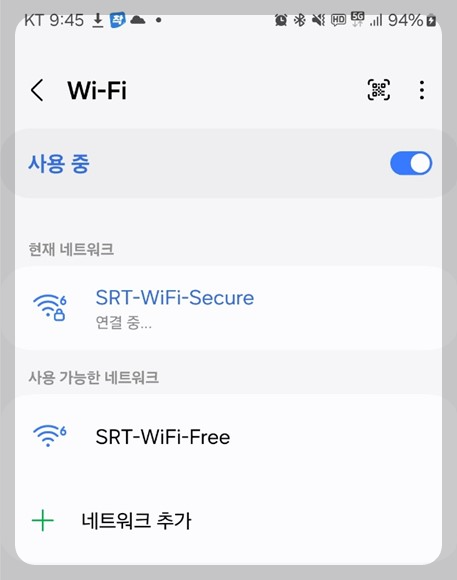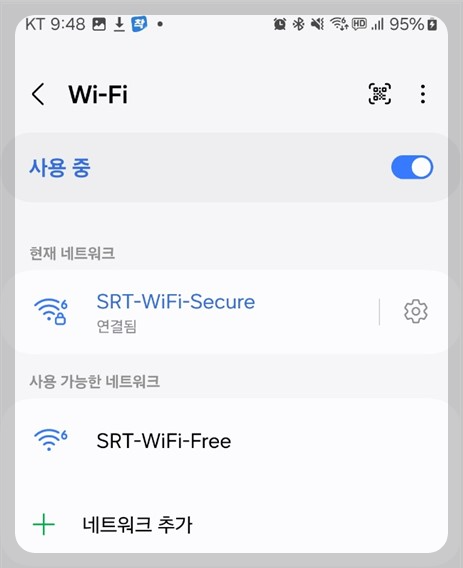 와이파이에서 "사용가능한 네트워크"에 SRT-WiFi-Free 가 잡힐 텐데, 이는 언제나 잡히는 와이파이입니다.