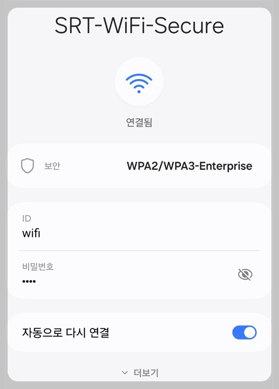 참고로 한번 보안 와이파이 접속 시 다음에 SRT를 이용할 때 자동으로 접속됩니다.