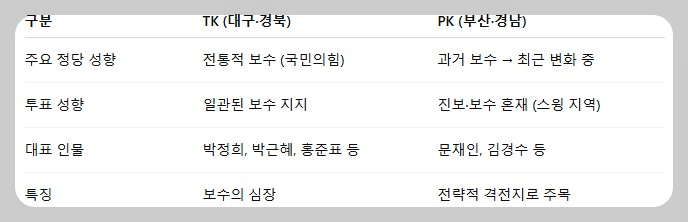 - TK / PK 차이점은 무엇인가요? "TK는 대구/경북으로 보수 색채가 뚜렷, PK는 부산/경남으로 정치 성향 변화가 활발"